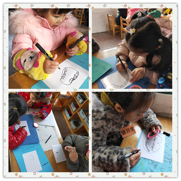 孩子们开始了画牙之路。一个个拿着镜子,张大嘴巴,“我要先画一个大圆。”萱萱拿着笔一圈。“为什么要画圆?”垚垚挠挠头。“因为我们的嘴巴是圆的啊!”莘莘大声地说到。