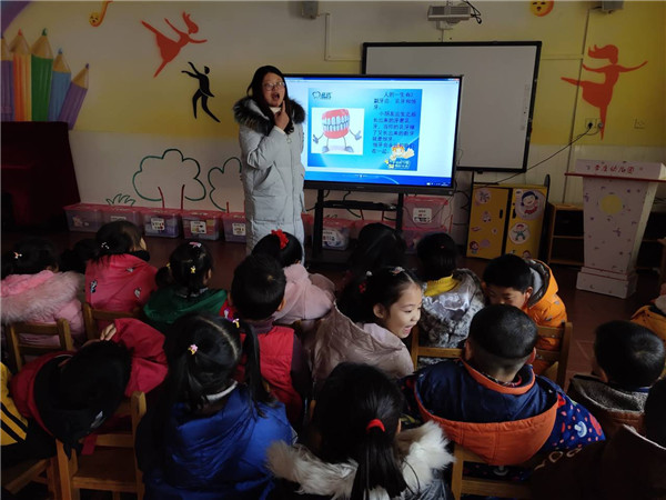 孩子们伸出手指,开始刷牙,“小小牙刷手中拿,挤点牙膏把牙刷。上面刷刷,下面刷刷,牙齿刷的白又亮!”