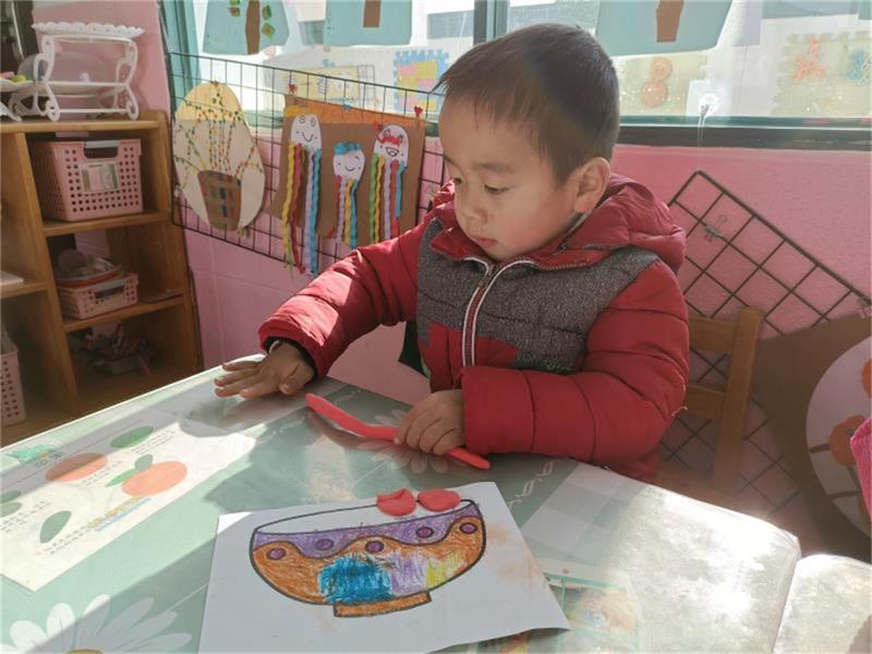 为了让孩子们更好地融入节日氛围,老师和孩子们展开了奇思妙想,组织一些好玩有趣的冬至活动。小班幼儿想自己尝试搓汤圆,怎么办呢?超轻黏土来帮忙,于是一碗碗“特别”的汤圆就出锅咯!中班幼儿紧跟其后,你搓汤圆我包饺,大家一起捏捏捏。孩子们觉得不尽兴,于是一起创编了《包饺子》手指操,“抹点油,撒点盐,和点面。”大家玩的乐呵呵!